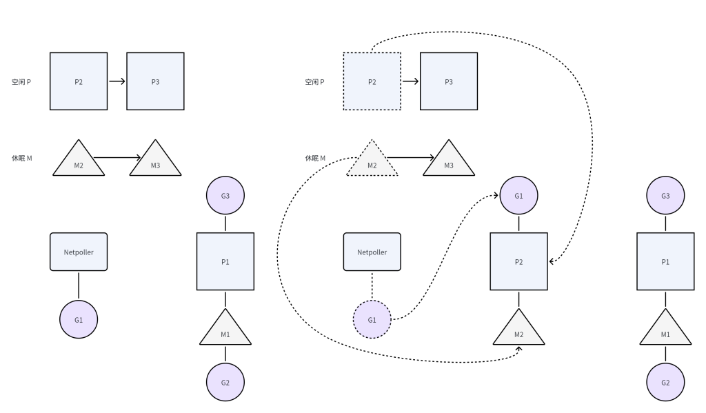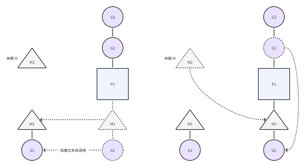 GM 会和 P 分离,G 和 M 一起进入挂起状态,如果 P 中仍有可运行的 G,会唤醒一个休眠的 M 或创建一个新的 M 来关联 P(Hand Off)