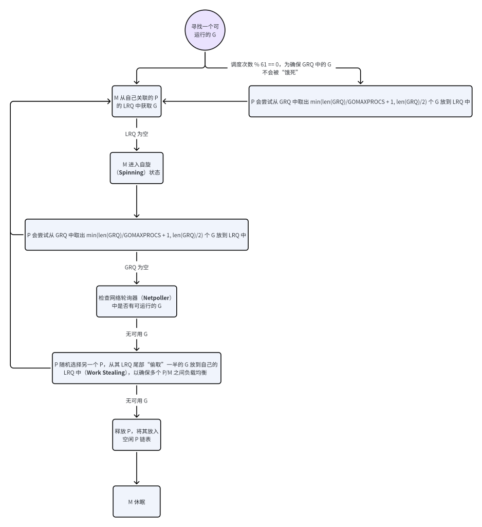 当阻塞式系统调用完成,M 会尝试关联一个空闲的 P(优先关联原来的 P)以执行 G,如果没有空闲的 P,G 被放入 GRQ,M 休眠