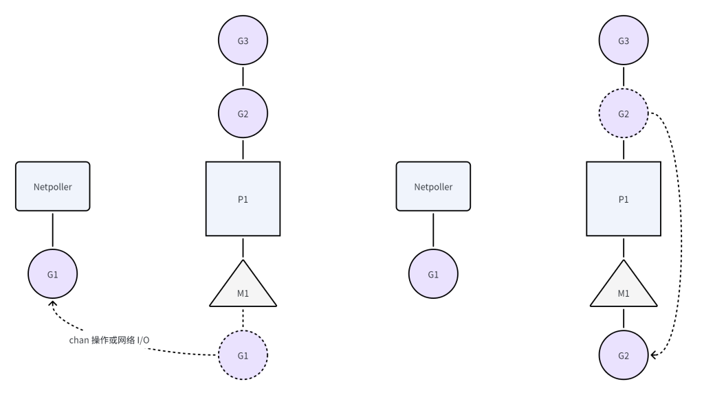 当进行 chan 操作或网络 I/O 时,G 会和 MP 分离,被挂到 Netpoller 上,M 会进行下一次调度